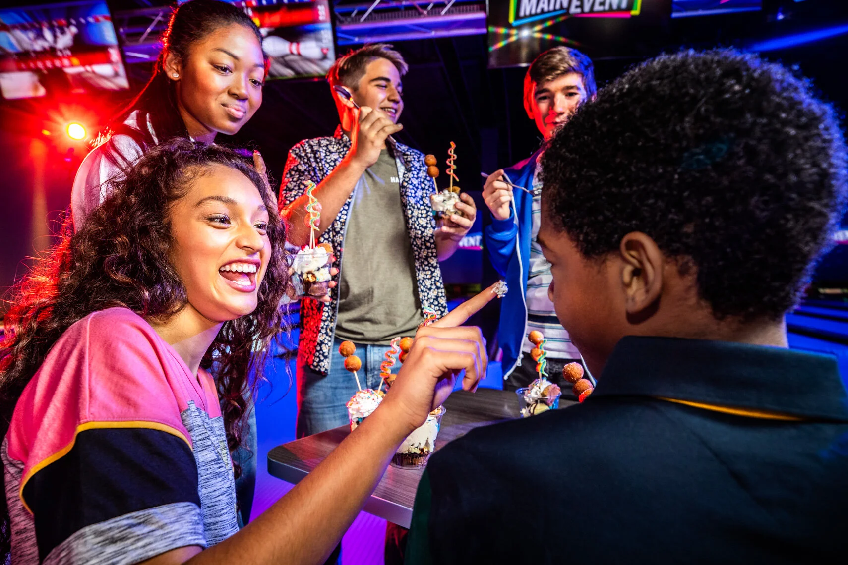 I photographed my daughter, her boyfriend and their “crew” during a midnight bowling - birthday party. The bowling alley had changed over from their typical daylight illumination to subdued colored lighting, louder music and a general party atmosphere.
